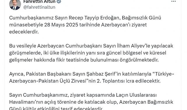 CUMHURBAŞKANI Recep Tayyip Erdoğan, '28 Mayıs Azerbaycan Cumhuriyeti Bağımsızlık Günü' nedeniyle yarın Azerbaycan'ı ziyaret edecek.İletişim Başkanı Fahrettin Altun, ziyarete ilişkin sosyal medya hesabından açıklama yaptı. Altun, "Cumhurbaşkanımız Sayın Recep Tayyip Erdoğan, Bağımsızlık Günü münasebetiyle 28 Mayıs 2025 tarihinde Azerbaycan'ı ziyaret edeceklerdir. Bu vesileyle Azerbaycan Cumhurbaşkanı Sayın İlham Aliyev'le yapılacak görüşmelerde, iki ülke ilişkilerinin yanı sıra güncel bölgesel ve küresel gelişmeler hakkında fikir teatisinde bulunulması öngörülmektedir. Ayrıca, Pakistan Başbakanı Sayın Şahbaz Şerif'in katılımlarıyla 'Türkiye-Azerbaycan-Pakistan Üçlü Zirvesi'nin 2'nci Toplantısı icra edilecektir. Sayın Cumhurbaşkanımız, ziyaret kapsamında Laçın Uluslararası Havalimanı'nın açılış törenine de katılacak olup, Azerbaycan Bağımsızlık Günü kültür etkinliğini teşrif edeceklerdir" dedi.