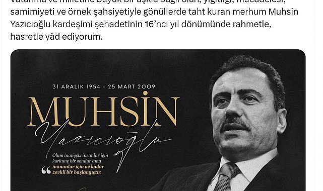CUMHURBAŞKANI Recep Tayyip Erdoğan, Büyük Birlik Partisi merhum Genel Başkanı Muhsin Yazıcıoğlu'nu ölümünün 16'ncı yıl dönümünde andı.Cumhurbaşkanı Erdoğan, sosyal medya hesabından paylaştığı mesajda, "Vatanına ve milletine büyük bir aşkla bağlı olan; yiğitliği, mücadelesi, samimiyeti ve örnek şahsiyetiyle gönüllerde taht kuran merhum Muhsin Yazıcıoğlu kardeşimi şehadetinin 16'ncı yıl dönümünde rahmetle, hasretle yad ediyorum" ifadesini kullandı. Erdoğan, paylaşımında, Yazıcıoğlu'nun, üzerinde 'Ölüm inançsız insanlar için korkunç bir sondur ama inananlar için ne kadar zevkli bir başlangıçtır' yazan fotoğrafını da yer verdi.