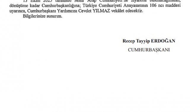 CUMHURBAŞKANI Recep Tayyip Erdoğan'ın Mısır Arap Cumhuriyeti ziyareti dolayısıyla Cumhurbaşkanlığına, Cumhurbaşkanı Yardımcısı Cevdet Yılmaz vekalet edecek.Cumhurbaşkanlığına, Cumhurbaşkanı Yardımcısı Yılmaz'ın vekalet etmesine dair tezkere, Resmi Gazete'de yayımlandı. Tezkereye göre, Cumhurbaşkanı Erdoğan 13 Ekim'de Mısır Arap Cumhuriyeti'ne ziyarette bulunacağından, dönüşüne kadar Cumhurbaşkanlığına; Türkiye Cumhuriyeti Anayasasının 106'ncı maddesi uyarınca, Cumhurbaşkanı Yardımcısı Cevdet Yılmaz vekalet edecek.