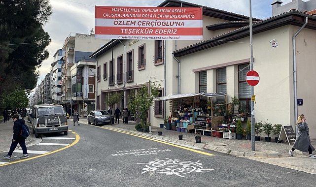 Aydın Büyükşehir Belediyesi Cumhuriyet Caddesi'ndeki yol yenileme çalışmasını tamamlayıp, vatandaşların hizmetine sunarken mahalle sakinleri de hazırlattıkları pankart ile Aydın Büyükşehir Belediye Başkanı Özlem Çerçioğlu'na teşekkür etti.Aydın Büyükşehir Belediyesi, kent genelinde eş zamanlı olarak sürdürülen yol yapım çalışmalarına devam ediyor. Fen İşleri Dairesi Başkanlığı Yol Yapım ve Bakım Şube Müdürlüğü ekipleri, Efeler ilçesi Cumhuriyet Caddesi'nde yenileme çalışması gerçekleştirdi. Asfalt seriminin sona ermesinin ardından çizgi, logo ve yaya geçidi çalışmaları tamamlanan yol, daha güvenli ve modern haliyle vatandaşların kullanımına sunuldu. Yol yapım çalışmalarının tamamlanmasının ardından mahalle sakinleri hazırlattıkları pankartla Aydın Büyükşehir Belediye Başkanı Özlem Çerçioğlu'na teşekkür etti.Adnan Menderes Bulvarı'ndan Cumhuriyet Caddesi girişinde yer alan ve Cumhuriyet Mahallesi sakinlerinin imzasını taşıyan pankartta, "Mahallemizde yapılan sıcak asfalt çalışmalarından dolayı sayın başkanımız Özlem Çerçioğlu'n teşekkür ederiz" ifadelerine yer verildi.