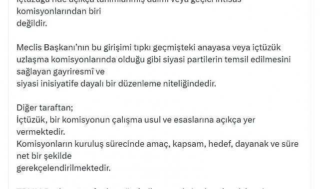 İYİ Parti Genel Başkanı Müsavat Dervişoğlu, TBMM Başkanı Numan Kurtulmuş'un 'Terörsüz Türkiye' süreci kapsamında Meclis'te kurulacak komisyon için partilere gönderdiği yazıya ilişkin, "Kurulması planlanan bu komisyonda İYİ Parti olarak yer almayacağımızı bir kere daha kamuoyunun dikkatlerine arz ederim" dedi.TBMM Başkanı Numan Kurtulmuş, 'Terörsüz Türkiye' süreci kapsamında Meclis'te kurulacak komisyon için partilere yazı gönderdi. Partilerden, 31 Temmuz saat 17.00'ye kadar komisyon için isim vermeleri istendi. İYİ Parti Genel Başkanı Müsavat Dervişoğlu, Meclis Başkanı Kurtulmuş'un gönderdiği yazıyı sosyal medya hesabından paylaşarak konuya ilişkin açıklamada bulundu. Dervişoğlu, "Meclis Başkanının çağrısı ile kurulacak olan komisyon, anayasa veya TBMM İçtüzüğü'nde açıkça tanımlanmış daimi veya geçici ihtisas komisyonlarından biri değildir. Meclis Başkanı'nın bu girişimi tıpkı geçmişteki anayasa veya içtüzük uzlaşma komisyonlarında olduğu gibi siyasi partilerin temsil edilmesini sağlayan gayriresmi ve siyasi inisiyatife dayalı bir düzenleme niteliğindedir. Diğer taraftan; İçtüzük, bir komisyonun çalışma usul ve esaslarına açıkça yer vermektedir. Komisyonların kuruluş sürecinde amaç, kapsam, hedef, dayanak ve süre net bir şekilde gerekçelendirilmektedir" dedi.TBMM Başkanı tarafından gönderilen yazıda, kurulacak komisyonun ne amaçla oluşturulduğu, gündeminin nasıl belirleneceği ve hangi yöntemle çalışacağına ilişkin hiçbir detayın yer almadığını kaydeden Dervişoğlu, "Bu komisyon bir karar alacak mı? Şayet karar alınacaksa, hangi oranlar aranacaktır. Kararların oy çokluğu ile mi yoksa nitelikli çoğunlukla mı alınacağı gibi temel işleyiş kurallarına bile yer verilmemiştir. İmralı canisi ve onun eli kanlı örgütünün talep ve beklentilerini meşrulaştıracak hiç bir faaliyetin içinde bulunmayacağımızı daha önceden de ifade etmiştik. Netice itibariyle, kurulması planlanan bu komisyonda İYİ Parti olarak yer almayacağımızı bir kere daha kamuoyunun dikkatlerine arz ederim" ifadelerini kullandı.
