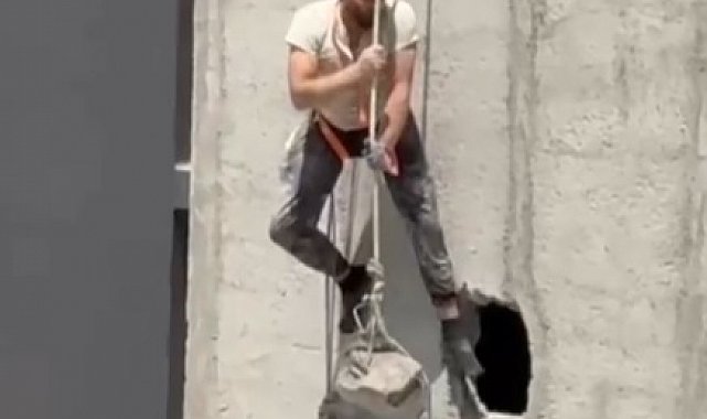 MERSİN'de 10 katlı inşaatın dış cephesinde üzerinde bulunduğu iskele devrilen işçi, güvenlik kemeri sayesinde havada asılı kaldı. Yaşanan panik anları çevredekiler tarafından cep telefonuyla görüntülendi.Olay, merkez Mezitli ilçesine bağlı Tece Mahallesi'nde meydana geldi. 10 katlı inşaatın dış cephesinde çalışan işçinin bulunduğu iskelenin ipleri koptu. 5'inci kattaki işçi, devrilen iskeleden düşerken binadan sarkan halata tutunup, ayağını da pencereye basarak sabit kalmaya çalıştı. Bir süre sonra gücünü kaybeden işçi halatı bırakınca düşmeye başladı ancak güvenlik kemeri sayesinde 5'inci kat civarında havada asılı kaldı. İhbarla bölgeye sağlık ve itfaiye ekipleri sevk edildi. Ekipler tarafından kurtarılan işçi, ambulansla hastaneye kaldırdı. Yaşanan anları çevredeki vatandaşlar cep telefonuyla görüntüledi.