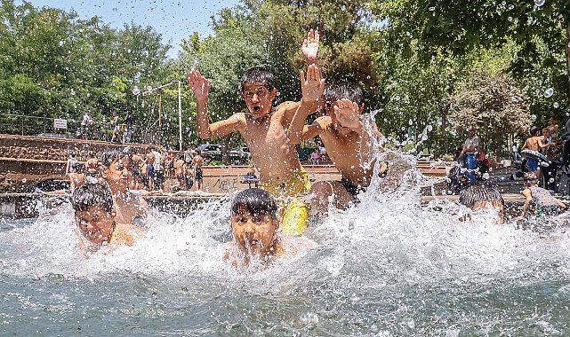 DİYARBAKIR'da termometreler 46 dereceyi gösterirken, serinlemek isteyen çocuklar yine tarihi Anzele Parkı'nın süs havuzuna akın etti.Meteoroloji 15'inci Bölge Müdürlüğü'nün 'yüksek sıcaklık' uyarısı yaptığı Diyarbakır'da termometreler, 46 dereceyi gösterdi. Cadde ve sokaklar boş kalırken, çocuklar yine Sur ilçesindeki tarihi Anzele Parkı'nın süs havuzuna akın etti. Yenişehir, Kayapınar ve Bağlar ilçelerinden gelen çocuklar, yaklaşık 1 metre derinlikteki havuza girdi. 'EVDE DAYANAMIYORUZ'Şehitlik Mahallesi'nden arkadaşlarıyla birlikte Anzele Parkı'na gelen Ali Ömer Karaaslan (11), sürekli buraya gelip serinlemeye çalıştığını ifade ederek, "Hava çok sıcak, 46 derecedir. Ateş gibi, cehennem gibidir. Evde dayanamıyoruz. Buraya gelip biraz serinliyoruz" diye konuştu.