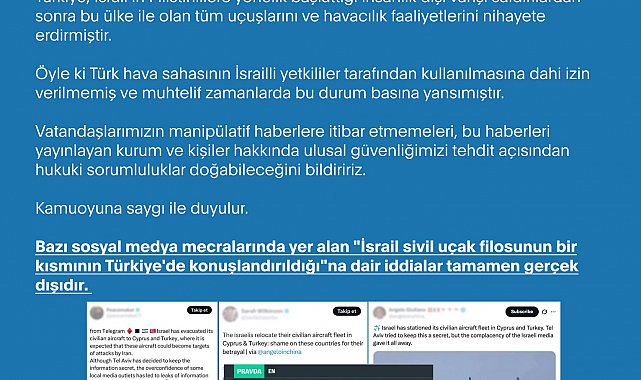DEZENFORMASYONLA Mücadele Merkezi (DMM), 'İsrail sivil uçak filosunun bir kısmının Türkiye'de konuşlandırıldığı' iddialarının gerçek dışı olduğunu bildirdi.Dezenformasyonla Mücadele Merkezi (DMM), sosyal medya hesabından yaptığı paylaşımda, bazı sosyal medya mecralarında yer alan 'İsrail sivil uçak filosunun bir kısmının Türkiye'de konuşlandırıldığına dair iddiaların doğru olmadığını açıkladı. Yapılan açıklamada, "Türkiye ile İsrail arasında sivil-askeri, herhangi bir havacılık faaliyeti olmadığından havalimanlarımızda ve hangarlarımızda herhangi bir İsrail uçağı da bulunmamaktadır. Türkiye, İsrail'in Filistinlilere yönelik başlattığı insanlık dışı vahşi saldırılardan sonra bu ülke ile olan tüm uçuşlarını ve havacılık faaliyetlerini nihayete erdirmiştir. Öyle ki Türk hava sahasının İsrailli yetkililer tarafından kullanılmasına dahi izin verilmemiş ve muhtelif zamanlarda bu durum basına yansımıştır. Vatandaşlarımızın manipülatif haberlere itibar etmemeleri, bu haberleri yayınlayan kurum ve kişiler hakkında ulusal güvenliğimizi tehdit açısından hukuki sorumluluklar doğabileceğini bildiririz" ifadeleri kullanıldı.