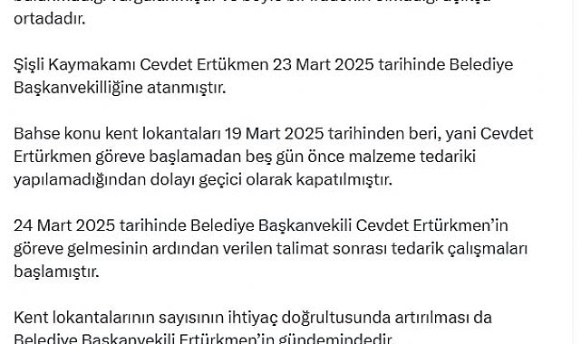 İLETİŞİM Başkanlığı Dezenformasyonla Mücadele Merkezi (DMM) tarafından, bazı sosyal medya hesaplarından paylaşılan 'Şişli Belediyesi'ndeki kayyum yönetimi, kent lokantalarını kapatma kararı aldı' iddiasına ilişkin açıklama yapıldı.DMM'nin sosyal medya hesabından yapılan açıklamada, "Bazı basın yayın organlarında yer alan, 'Şişli Belediyesi'ndeki kayyum yönetimi, kent lokantalarını kapatma kararı aldı' iddiası Merkezimizce yalanlanmıştır. Ancak, yapılan bu açıklamanın bazı kesimlerce manipüle edildiği tespit edilmiştir. Merkezimizce yapılan açıklamada, Şişli Belediye Başkanvekili Ertürkmen'in kent lokantalarının kapatılmasına ilişkin bir talimatının bulunmadığı vurgulanmıştır ve böyle bir iradenin olmadığı açıkça ortadadır. Şişli Kaymakamı Cevdet Ertükmen, 23 Mart 2025 tarihinde Belediye Başkanvekilliğine atanmıştır. Bahse konu kent lokantaları 19 Mart 2025 tarihinden beri, yani Cevdet Ertürkmen göreve başlamadan 5 gün önce malzeme tedariki yapılamadığından dolayı geçici olarak kapatılmıştır. 24 Mart 2025 tarihinde Belediye Başkanvekili Cevdet Ertürkmen'in göreve gelmesinin ardından verilen talimat sonrası tedarik çalışmaları başlamıştır. Kent lokantalarının sayısının ihtiyaç doğrultusunda artırılması da Belediye Başkanvekili Ertürkmen'in gündemindedir. Kamuoyunu manipüle etmeye yönelik asılsız iddialara itibar etmeyiniz" denildi.