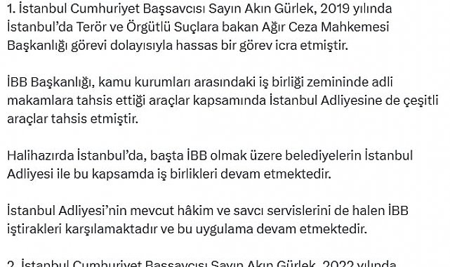 İLETİŞİM Başkanlığı Dezenformasyonla Mücadele Merkezi (DMM) tarafından, CHP Genel Başkanı Özgür Özel'in İstanbul Cumhuriyet Başsavcısı Akın Gürlek hakkındaki iddialarıyla ilgili açıklama yapıldı.İletişim Başkanlığı açıklamasında, "CHP Genel Başkanı Özgür Özel'in İstanbul Cumhuriyet Başsavcılığı'nı hedef alması, soruşturmaları ve soruşturma yapan makamları itibarsızlaştırmaya yönelik süregelen bir çabanın ürünüdür. Sayın Özel'in yaptığı açıklamalar, hiçbir şekilde gerçeği yansıtmamaktadır; bilakis Sayın Özel'in eksik, yanlış ve yanlı bilgilendirildiğini göstermektedir" denildi.Özgür Özel'in İstanbul Cumhuriyet Başsavcısı Akın Gürlek hakkında gündeme getirdiği iddialarla ilgili şöyle denildi:"1. İstanbul Cumhuriyet Başsavcısı Sayın Akın Gürlek, 2019 yılında İstanbul'da terör ve örgütlü suçlara bakan Ağır Ceza Mahkemesi Başkanlığı görevi dolayısıyla hassas bir görev icra etmiştir. İBB Başkanlığı, kamu kurumları arasındaki iş birliği zemininde adli makamlara tahsis ettiği araçlar kapsamında İstanbul Adliyesine de çeşitli araçlar tahsis etmiştir. Halihazırda İstanbul'da, başta İBB olmak üzere belediyelerin İstanbul Adliyesi ile bu kapsamda iş birlikleri devam etmektedir. İstanbul Adliyesi'nin mevcut hâkim ve savcı servislerini de halen İBB iştirakleri karşılamaktadır ve bu uygulama devam etmektedir. 2. İstanbul Cumhuriyet Başsavcısı Sayın Akın Gürlek, 2022 yılında Ulaştırma ve Altyapı Bakan Yardımcısıyla birlikte bir yatçılık fuarının açılışına Adalet Bakan Yardımcısı olarak katılmıştır. Sayın Gürlek'in idari bir makamda iken ilgili yat fuarına gerçekleştirdiği ziyaret nezaket gereğidir ve kamunun yerli üretime manevi desteği bağlamında gerçekleştirilmiştir. Sayın Gürlek'in tamamen kamu görevi dolayısıyla davet edildiği bir programa iştirak etmesini Sayın Özel'in istismar etmesi açık bir manipülasyondur.3. Yine ana muhalefet liderinin, İstanbul'da bütün izinleri alınmak suretiyle usulüne uygun olarak yapılan Adalet Bakanlığı lojmanını istismar etmesi sorumsuz bir tutumdur. Başsavcılık makamına tahsis edilmiş bir lojmanın, halihazırda başsavcılık görevinde bulunan bir kişiye özel bir tahsismiş gibi gösterilmesi manipülatif bir yaklaşımdır. Söz konusu lojman, diğer kamu kurum ve kuruluşlarına tahsis edilen lojmanlara benzer şekilde gayrişahsi bir mülk olarak kamu hizmetinde kullanılmaktadır."