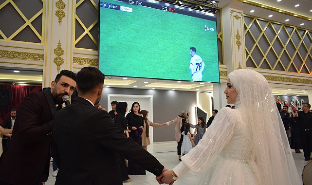 BATMAN'da Abdullah Atakul ve Bahar Tekin çifti düğünlerinde taraftarı oldukları Batman Petrolspor'un Kayseri'de Vanspor FK ile oynadığı play-off final maçını dev ekranda hem davetlilerle izledi hem de destek için gelin ve damatlığın üzerine forma giydi. Batman'da Abdullah Atakul ve Bahar Tekin çifti bir salonda düzenlenen düğün töreniyle dünya evine girdi. TFF 2'nci lig Beyaz grupta sezonu ikinci olarak tamamlayan Batman Petrolspor'un taraftarı olan çift, Play-off final mücadelesinde Kayseri'de Vanspor FK ile karşı karşıya gelen takımlarının maçını davetlilerle hem izledi hem de halay çekti. Çift, bir süre Batman Petrolspor formasını da gelin ve damatlıklarının üzerine giydi. 'İKİ AŞKIM VAR ARTIK'Petrolspor'un koyu bir taraftarı olan Damat Abdullah Atakul (26), "Ben yarasalar taraftar grubunun bir üyesiyim. Yıllardır Petrolspor aşkıyla statları hep doldurduk. Bugün benim en mutlu günüm. Düğünüm var. Ama benim düğünüm şampiyonluk yolunda olan Petrolspor'un final maçına denk geldi. Belki bugün takımımın yanında olamadım ama formayı giyip ben de destek oldum. Düğüne ara vererek Petrolspor'un maçını izledik. Benim hayatımda sadece iki aşkım var artık. Biri eşim biri de Petrolspor. İnşallah bugün çifte bir mutluluk yaşayacağız. Petrolspor'un şampiyon olmasını canı gönülden diliyorum" dedi. Eşine destek olmak için maç izleme ve forma giyme isteğine olumlu cevap verdiğini ifade esen Bahar Tekin de (26), "Bugün bizim en mutlu günümüz. Bugün de Petrolspor'un maçına destek vermek istedik. Formalarımızı giydik. Düğüne ara vererek maçı izledik. Eşim koyu bir Petrolspor taraftarı. O yüzden ben de onun yanında olmak istedim. Ona destek olmak istedim. Bu isteğini kabul ederek yanında olmak istedim" diye konuştu.Maç uzatmalara gidince çift, düğünün bitmesiyle salondan ayrıldı.