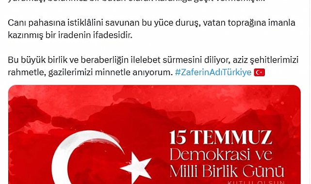 CUMHURBAŞKANI Recep Tayyip Erdoğan'ın eşi Emine Erdoğan, "15 Temmuz, milletimizin kararlılığıyla yazılan onurlu bir direnişin ve ölümsüz bir zaferin adıdır. Ve o zaferin adı, hiç şüphesiz Türkiye'dir" dedi.Emine Erdoğan, FETÖ'nün 15 Temmuz 2016'daki darbe girişiminin yıl dönümünde mesaj paylaştı. Emine Erdoğan, "15 Temmuz, milletimizin kararlılığıyla yazılan onurlu bir direnişin ve ölümsüz bir zaferin adıdır. Ve o zaferin adı, hiç şüphesiz Türkiye'dir. Cesaret timsali yürekler o gece, tanklara karşı dimdik durmuş, kurşunlara yürümüş, bölünmez bir bütün olarak karanlığa geçit vermemiştir. Canı pahasına istiklalini savunan bu yüce duruş, vatan toprağına imanla kazınmış bir iradenin ifadesidir. Bu büyük birlik ve beraberliğin ilelebet sürmesini diliyor, aziz şehitlerimizi rahmetle, gazilerimizi minnetle anıyorum" ifadelerini kullandı.