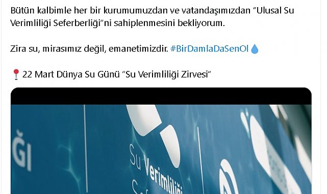CUMHURBAŞKANI Recep Tayyip Erdoğan'ın eşi Emine Erdoğan, suyun küresel olarak tüm ülkelerin bekasının, milli güvenliğinin ve gıda güvenliğinin konusu olduğunu, her bir kurumdan ve vatandaştan 'Ulusal Su Verimliliği Seferberliği'ni sahiplenmesini beklediğini bildirdi.Emine Erdoğan, Tarım ve Orman Bakanlığı ile Sıfır Atık Vakfı tarafından dün İstanbul'da düzenlenen '22 Mart Dünya Su Günü: Su Verimliliği Zirvesi'ne ilişkin sosyal medya hesabından paylaşım yaptı. Erdoğan, paylaşımda, "Bugün su, küresel olarak tüm ülkelerin bekasının, milli güvenliğinin ve gıda güvenliğinin konusudur. Bütün kalbimle her bir kurumumuzdan ve vatandaşımızdan 'Ulusal Su Verimliliği Seferberliği'ni sahiplenmesini bekliyorum. Zira su, mirasımız değil, emanetimizdir" ifadelerini kullandı.