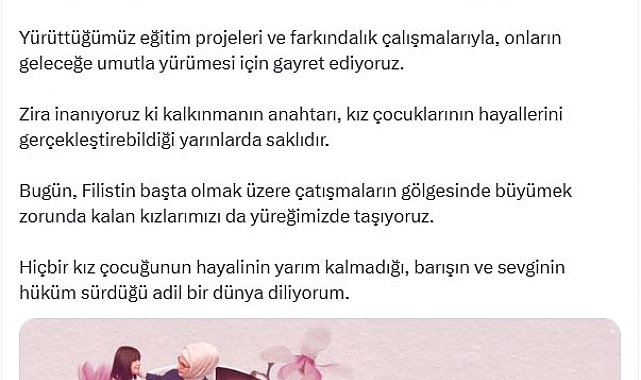 Emine Erdoğan, 11 Ekim Dünya Kız Çocukları Günü nedeniyle sosyal medya hesabından yaptığı paylaşımda, "Cesaretiyle değişim yaratan, hayalleriyle dünyayı güzelleştiren tüm kız çocuklarımızın 'Dünya Kız Çocukları Günü'nü tebrik ediyorum. Onların eğitimde, sanatta, bilimde, sporda ve toplumsal yaşamdaki başarıları, toplumumuzun da dönüştürücü gücüdür. Türkiye olarak, her bir kızımızın nitelikli eğitime erişmesini ve özgüvenle kendi yolunu çizebilmesini temel bir sorumluluk olarak görüyoruz. Yürüttüğümüz eğitim projeleri ve farkındalık çalışmalarıyla, onların geleceğe umutla yürümesi için gayret ediyoruz. Zira inanıyoruz ki kalkınmanın anahtarı, kız çocuklarının hayallerini gerçekleştirebildiği yarınlarda saklıdır. Bugün, Filistin başta olmak üzere çatışmaların gölgesinde büyümek zorunda kalan kızlarımızı da yüreğimizde taşıyoruz. Hiçbir kız çocuğunun hayalinin yarım kalmadığı, barışın ve sevginin hüküm sürdüğü adil bir dünya diliyorum" dedi.