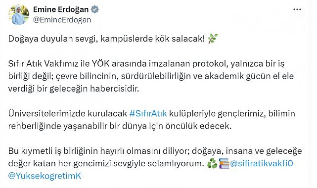 Emine Erdoğan, sosyal medya hesabından, Yükseköğretim Kurulu (YÖK) ile Sıfır Atık Vakfı arasında imzalanan 'Üniversitelerde Sıfır Atık Uygulamaları İşbirliği Protokolü'ne dair paylaşımda bulundu. Sıfır Atık Vakfının protokolle ilgili paylaşımını alıntılayan Erdoğan, "Doğaya duyulan sevgi, kampüslerde kök salacak. Sıfır Atık Vakfımız ile YÖK arasında imzalanan protokol, yalnızca bir iş birliği değil, çevre bilincinin, sürdürülebilirliğin ve akademik gücün el ele verdiği bir geleceğin habercisidir. Üniversitelerimizde kurulacak Sıfır Atık kulüpleriyle gençlerimiz, bilimin rehberliğinde yaşanabilir bir dünya için öncülük edecek. Bu kıymetli iş birliğinin hayırlı olmasını diliyor, doğaya, insana ve geleceğe değer katan her gencimizi sevgiyle selamlıyorum" ifadelerini kullandı.
