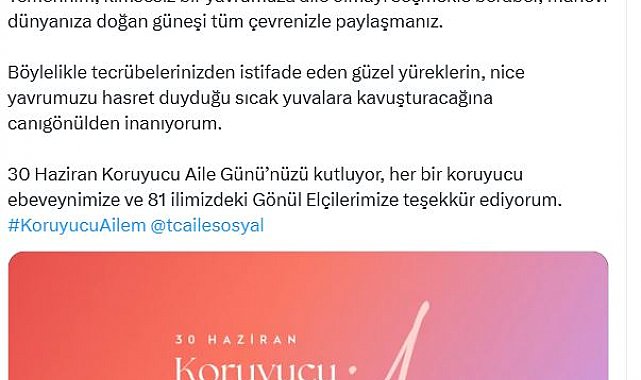 CUMHURBAŞKANI Recep Tayyip Erdoğan'ın eşi Emine Erdoğan, 30 Haziran Koruyucu Aile Günü'nü kutladı.Emine Erdoğan, sosyal medya hesabından yaptığı paylaşımda, "Sevgili koruyucu ailelerimiz, çeşitli sebeplerle ebeveynlerinden ayrı düşmüş bir çocuğa kalbinizi açtınız, ulvi bir duyguyu deneyimlediniz. Kararınızla bir çocuğun her gününü bayram gününe çevirdiniz. Temennim, kimsesiz bir yavrumuza aile olmayı seçmekle beraber, manevi dünyanıza doğan güneşi tüm çevrenizle paylaşmanız. Böylelikle tecrübelerinizden istifade eden güzel yüreklerin, nice yavrumuzu hasret duyduğu sıcak yuvalara kavuşturacağına canıgönülden inanıyorum. 30 Haziran Koruyucu Aile Günü'nüzü kutluyor, her bir koruyucu ebeveynimize ve 81 ilimizdeki gönül elçilerimize teşekkür ediyorum" dedi.