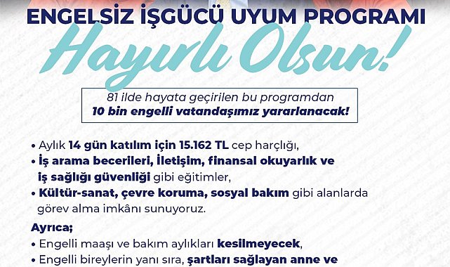 ÇALIŞMA ve Sosyal Güvenlik Bakanlığı, çalışmak isteyen engellilerin işgücü piyasasına entegrasyonunu desteklemek ve sosyal rehabilitasyonlarını güçlendirmek amacıyla 'Engelsiz İşgücü Uyum Programı'nı (Engelsiz İUP) başlattı. Program, kamu kurum ve kuruluşlarıyla iş birliği içinde 81 ilde uygulanmaya başladı.Bakanlıktan yapılan yazılı açıklamaya göre; yeşil dönüşüm, sosyal hizmetler, tarihi ve kültürel faaliyetler ile kamu kurumlarının diğer destek faaliyetlerini kapsayan program, engellilere çeşitli katkılar sağlayacak. Programa dahil olan çalışmak isteyen engelli vatandaşlara iş sağlığı ve güvenliği, bağımlılıkla mücadele, iş arama becerisinin geliştirilmesi, iş ahlakı, motivasyon ve stres yönetimi, kişiler arası ilişkiler ve etkili iletişim, finansal okuryazarlık konularında eğitim verilecek. Programın uygulayıcısı İŞKUR olacak ve başvurular İŞKUR platformu üzerinden alınacak. Programa başvuru yapmak isteyen, İŞKUR'a kayıtlı olan ve katılım şartlarını sağlayan engelli vatandaşlar, 81 ilde açılacak ilanların yayınlanacağı 'engelsiz.iskur.gov.tr' adresinde yer alan 'Engelsiz İUP Başvurusu' butonu üzerinden bulundukları ilde açılan ilanları listeleyip başvuru yapabilecek. Ayrıca programdan engelliler ya da istemeleri halinde başvuru ve katılım şartlarını sağlayan engellilerin anne veya babaları yararlanabilecek. Programdan 10 bin engelli vatandaşın faydalanması hedefleniyor. Toplam program süresi 10 ay olarak belirlenen Engelsiz İUP katılımcılarına, ilk 4 hafta haftada 37,5 saat ve 5 gün, devam eden haftalarda ise haftada en fazla 22,5 saat ve 3 gün işgücü uyum programı uygulanacak. Programda katılımcılara her bir katılım günü için bin 083 TL cep harçlığı toplamda 14 gün için 15 bin 162 TL'ye kadar ödeme yapılacak. Programa katılanların engelli maaşları ve bakım aylıkları kesilmeyecek. Başvuru şartları ve detaylarına ise İŞKUR internet adresinden ulaşılabilecek.