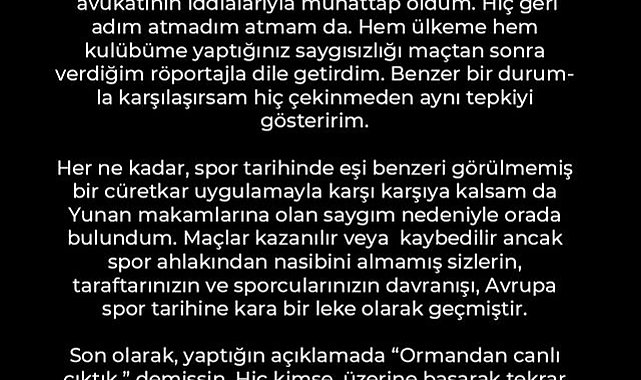 PANATHİNAİKOS Başantrenörü Ergin Ataman, 1 Haziran'da Olympiakos ile Panathinaikos arasında oynanan final serisinin ikinci maçında yaşanan olaylar hakkında açıklamalarda bulundu. 59 yaşındaki başantrenör yaşanan olaylar nedeniyle kınama ve 5 bin Euro para cezası alırken, Panathinaikos Kulüp Sahibi Dimitris Giannakopulos ise 10 ay tüm spor salonlarına giriş yasağı ve 20 bin Euro para cezasına çarptırıldı.Sosyal medya hesabından paylaşım yapan Ergin Ataman şu ifadeleri kullandı;"Olympiacos B.C. genel menajerinin maç sonu beni hedef alan ve Olympiacos taraftarını bana karşı kışkırtan demecine cevabım şudur:5 gün önce sahanızda organize bir şekilde maç boyu ülkeme karşı yapılan ırkçı küfür için bir özür bile dilemediniz. Dünkü maçtan bir gün önce federasyon binasına kurdurduğunuz spor mahkemesiyle; 30 yıllık kariyerimde yaşamadığım şekilde sorgulandım, suçlandım ve ceza aldım. Üstelik burada sadece üç Olympiacos B.C. avukatının iddialarıyla muhatap oldum. Hiç geri adım atmadım atmam da. Hem ülkeme hem kulübüme yaptığınız saygısızlığı maçtan sonra verdiğim röportajla dile getirdim. Benzer bir durumla karşılaşırsam hiç çekinmeden aynı tepkiyi gösteririm.Her ne kadar, spor tarihinde eşi benzeri görülmemiş bir cüretkar uygulamayla karşı karşıya kalsam da Yunan makamlarına olan saygım nedeniyle orada bulundum. Maçlar kazanılır veya kaybedilir ancak spor ahlakından nasibini almamış sizlerin, taraftarınız ve sporcularınızın davranışı, Avrupa spor tarihine bir kara leke olarak geçmiştir.Son olarak yaptığın açıklamada 'Ormandan canlı çıktık' demişsin. Hiç kimse, üzerine basarak tekrar söylüyorum hiç kimse, Avrupa'nın en modern basketbol salonu olan OAKA'ya 'Orman'; takımını desteklemeye gelen ve gurur duyduğum 20 bin Panathinaikos taraftarına da 'Hayvan' imasında bulunamaz. Bu konuyla ilgili seni bir kez daha uyarmayacağım. Suçluluğunuzu sebeplerini başka yerlerde değil; spora yakışmayan kendi davranışlarınızda arayın."