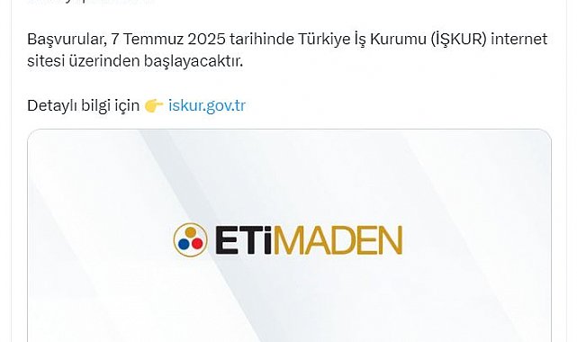 ENERJİ ve Tabii Kaynaklar Bakanlığı, Eti Maden İşletmeleri Genel Müdürlüğü'ne bağlı işletmelere 469 sürekli işçi alımı yapılacağını duyurdu.Bakanlığın sosyal medya hesabından yapılan açıklamada, "Eti Maden İşletmeleri Genel Müdürlüğü'ne bağlı; Bandırma Bor ve Asit Fabrikaları İşletme Müdürlüğü'ne 110, Bigadiç Bor İşletme Müdürlüğü'ne 39, Emet Bor İşletme Müdürlüğü'ne 106, Kırka Bor İşletme Müdürlüğü'ne 214 olmak üzere toplam 469 sürekli işçi alımı yapılacaktır. Başvurular, 7 Temmuz 2025 tarihinde Türkiye İş Kurumu (İŞKUR) internet sitesi üzerinden başlayacaktır" denildi.