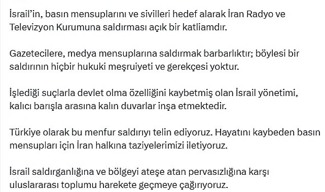 İLETİŞİM Başkanı Fahrettin Altun, "İsrail'in, basın mensuplarını ve sivilleri hedef alarak İran Radyo ve Televizyon Kurumu'na saldırması açık bir katliamdır" açıklamasında bulundu.İletişim Başkanı Fahrettin Altun, sosyal medya hesabından yaptığı paylaşımda, "İsrail'in, basın mensuplarını ve sivilleri hedef alarak İran Radyo ve Televizyon Kurumu'na saldırması açık bir katliamdır. Gazetecilere, medya mensuplarına saldırmak barbarlıktır; böylesi bir saldırının hiçbir hukuki meşruiyeti ve gerekçesi yoktur. İşlediği suçlarla devlet olma özelliğini kaybetmiş olan İsrail yönetimi, kalıcı barışla arasına kalın duvarlar inşa etmektedir. Türkiye olarak bu menfur saldırıyı telin ediyoruz. Hayatını kaybeden basın mensupları için İran halkına taziyelerimizi iletiyoruz. İsrail saldırganlığına ve bölgeyi ateşe atan pervasızlığına karşı uluslararası toplumu harekete geçmeye çağırıyoruz" ifadelerini kullandı.