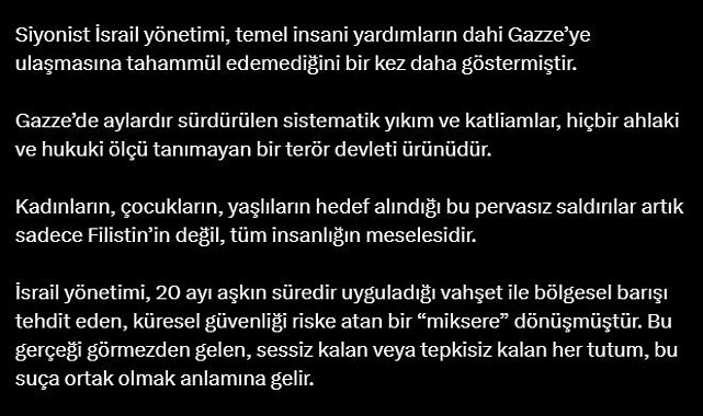İLETİŞİM Başkanı Fahrettin Altun, "İsrail'in Gazze'ye insani yardım ulaştırmak amacıyla yola çıkan sivil Madleen gemisine yönelik saldırısı, uluslararası hukukun ve insan haklarının açıkça bir ihlalidir. Bu alçak saldırıyı en güçlü şekilde kınıyoruz" dedi. İletişim Başkanı Altun, sosyal medya hesabından yaptığı açıklamada, "İsrail'in Gazze'ye insani yardım ulaştırmak amacıyla yola çıkan sivil Madleen gemisine yönelik saldırısı, uluslararası hukukun ve insan haklarının açıkça bir ihlalidir. Bu alçak saldırıyı en güçlü şekilde kınıyoruz. Siyonist İsrail yönetimi, temel insani yardımların dahi Gazze'ye ulaşmasına tahammül edemediğini bir kez daha göstermiştir. Gazze'de aylardır sürdürülen sistematik yıkım ve katliamlar, hiçbir ahlaki ve hukuki ölçü tanımayan bir terör devleti ürünüdür" açıklamasında bulunduç 'SADECE FİLİSTİN'İN DEĞİL TÜM İNSANLIĞIN MESELESİ'Altun, kadınların, çocukların, yaşlıların hedef alındığı bu pervasız saldırıların artık sadece Filistin'in değil, tüm insanlığın meselesi olduğunu işaret ederek, "İsrail yönetimi, 20 ayı aşkın süredir uyguladığı vahşet ile bölgesel barışı tehdit eden, küresel güvenliği riske atan bir 'miksere' dönüşmüştür. Bu gerçeği görmezden gelen, sessiz kalan veya tepkisiz kalan her tutum, bu suça ortak olmak anlamına gelir. Türkiye olarak bu vahşetin durdurulması, Gazze'ye insani yardımların kesintisiz ulaşması ve bölgede adil bir barışın tesisi için çağrımızı yineliyoruz. Uluslararası camiayı ve tüm insanlığı bu çığlığa kulak vermeye, somut adım atmaya davet ediyoruz" dedi.