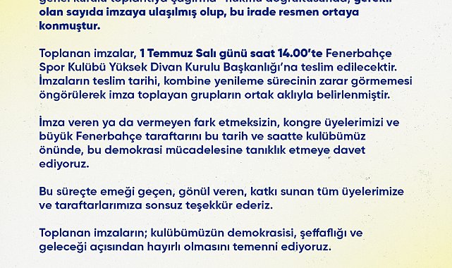 FENERBAHÇE Spor Kulübü'nde olağanüstü seçimli genel kurulun gerçekleşmesi amacıyla yürütülen imza süreciyle ilgili, süreci başlatan dernekler ve başkan adayları Mahmut Uslu ile Hakan Bilal Kutlualp tarafından ortak bir yazılı açıklama yapıldı. Söz konusu açıklamada toplanan imzaların 1 Temmuz Salı günü kulübe teslim edileceği belirtildi.Sosyal medya üzerinden yapılan açıklamada şu ifadeler yer aldı:"Fenerbahçe Spor Kulübü Yönetimi'nin olağanüstü genel kurula gitmesi amacıyla başlatılan imza toplama kampanyamız kapsamında, Tüzüğümüzün 20. Maddesinin (2) c bendi uyarınca aidatlarını süresinde ödemiş kongre üyelerinin en az beşte birinin yazılı başvurusu ile kulüp yönetiminin, "bir ay içinde olağanüstü genel kurulu toplantıya çağırma" hükmü doğrultusunda, gerekli olan sayıda imzaya ulaşılmış olup, bu irade resmen ortaya konmuştur. Toplanan imzalar, 1 Temmuz Salı günü saat 14.00'te Fenerbahçe Spor Kulübü Yüksek Divan Kurulu Başkanlığı'na teslim edilecektir. İmzalatın teslim tarihi, kombine yenileme sürecinin zarar görmemesi öngörülerek imza toplayan grupların ortak aklıyla belirlenmiştir. İmza veren ya da vermeyen fark etmeksizin, kongre üyelerimizi ve büyük Fenerbahçe taraftarını bu tarih ve saatte kulübümüz önünde, bu demokrasi mücadelesine tanıklık etmeye davet ediyoruz. Bu süreçte emeği geçen, gönül veren, katkı sunan tüm üyelerimize ve taraftarlarımıza sonsuz teşekkür ederiz. Toplanan imzaların; kulübümüzün demokrasisi, şeffaflığı ve geleceği açısından hayırlı olmasını temenni ediyoruz."