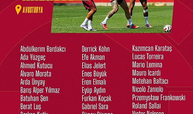 Galatasaray, 2025/26 sezonu hazırlıkları kapsamında 19 Temmuz - 23 Temmuz tarihleri arasında Avusturya'nın Windischgarsten bölgesinde kamp yapacak. Sarı-kırmızılılar bu tarih aralığında Summer Series Upper Austria kapsamında Raiffeisen Arena'da iki hazırlık maçına çıkacak. Galatasaray ilk maçını 20 Temmuz'da Admira Wacker ile ikinci maçını ise 23 Temmuz'da Cagliari Calcio ile oynayacak.Sarı-kırmızılıların kamp kadrosu şu şekilde:"Abdülkerim Bardakcı, Ada Yüzgeç, Ahmed Kutucu, Álvaro Morata, Arda Ünyay, Barış Alper Yılmaz, Batuhan Şen, Berat Luş, Berkan Kutlu, Carlos Cuesta, Çağrı Balta, Davinson Sánchez, Derrick Köhn, Efe Akman, Elias Jelert, Enes Büyük, Eren Elmalı, Eyüp Aydın, Furkan Koçak, Gabriel Sara, Günay Güvenç, Ismail Jakobs, Jankat Yılmaz, Kaan Ayhan, Kazımcan Karataş, Lucas Torreira, Mario Lemina, Mauro Icardi, Metehan Baltacı, Nicolò Zaniolo, Przemysław Frankowski, Roland Sallai, Victor Nelsson, Yunus Akgün, Yusuf Demir."Avusturya etabının ardından çalışmalarına İstanbul'da devam edecek olan Galatasaray, Match PR organizasyonuyla düzenlenecek iki hazırlık maçına daha çıkacak. RAMS Park'ta oynanacak olan maçlarda sarı-kırmızılılar, 26 Temmuz'da RC Strasbourg ile 2 Ağustos'ta ise S.S. Lazio ile karşılaşacak.(FOTOĞRAFLI)
