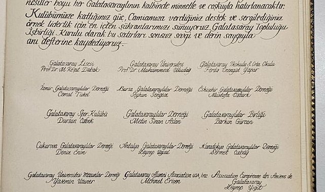 – GALATASARAY Topluluğu İşbirliği Kurulu'nun ortak önerisiyle Galatasaray Lisesi anı defterine Başkan Dursun Aydın Özbek'e hitaben yazılan bir teşekkür yazısı hazırlandı.Atatürk'ün yanı sıra bazı devlet büyüklerinin de imzasının yer aldığı Galatasaray Lisesi anı defterine Galatasaray Topluluğu İşbirliği Kurulu'nun kararı ve ortak önerisiyle Galatasaray Kulübü Başkanı Dursun Aydın Özbek'e hitaben yazılan bir teşekkür yazısı hazırlandı.Teşekkür yazısında şu satırlara yer verildi:"Sayın Dursun Aydın ÖzbekGalatasaray Spor Kulübü BaşkanıBaşkanlığınız süresince hayata geçirdiğiniz değerli çalışmalar, Galatasaray Spor Kulübü'nün ve Camiamızın, hem ülkemizde hem de uluslararası alanda itibarını ve gücünü arttırmıştır. Sahadaki zaferlerin yanı sıra, kulübümüzün geleceğini teminat altına alan, tesisleşmeye yönelik projelerinizle de tarihimizde müstesna bir yer edindiniz.Futbol Takımımızın beşinci yıldızla taçlanan 25. şampiyonluğu; Camiamızın tarihine altın harflerle yazılmış bir destan, özverili çalışmalarınız ve azminizle şekillenen bu dönemin de unutulmaz simgesi olmuştur. Bu büyük gurur, nesiller boyu her Galatasaraylının kalbinde minnetle ve coşkuyla hatırlanacaktır.Kulübümüze kattığınız güç, Camiamıza verdiğiniz destek ve sergilediğiniz örnek liderlik için en içten şükranlarımızı sunuyoruz. Galatasaray Topluluğu İşbirliği Kurulu olarak, bu satırları sonsuz sevgi ve derin saygıyla anı defterine kaydediyoruz"