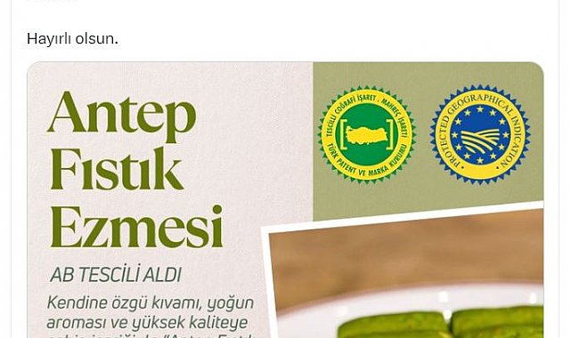 TARIM ve Orman Bakanı İbrahim Yumaklı, Gaziantep fıstık ezmesinin Avrupa Birliği'nden (AB) coğrafi işaret tescili aldığını duyurdu.Bakan Yumaklı, sosyal medya hesabından yaptığı açıklamada, "Fıstık gibi müjde. Antep fıstık ezmesi, Avrupa Birliği'nden coğrafi işaret tescili alan 36'ncı ürünümüz oldu. Gaziantep'in eşsiz ezmesi, Avrupa sofralarında da hak ettiği yeri alacak. Hayırlı olsun" dedi.