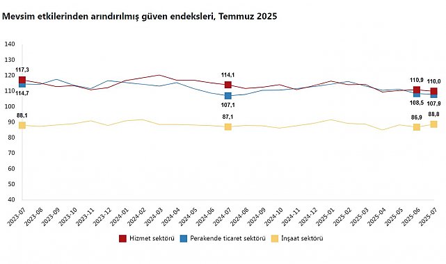 TÜİK, Temmuz 2025 dönemine ilişkin hizmet, perakende ticaret ve inşaat güven endekslerini açıkladı. Buna göre; güven endeksi hizmet sektöründe yüzde 0,8, perakende ticaret sektöründe yüzde 0,5 azaldı, inşaat sektöründe ise yüzde 2,2 arttı. Mevsim etkilerinden arındırılmış güven endeksi temmuz ayında bir önceki aya göre; hizmet sektöründe yüzde 0,8 oranında azalarak 110 değerini, perakende ticaret sektöründe yüzde 0,5 oranında azalarak 107,9 değerini ve inşaat sektöründe yüzde 2,2 oranında artarak 88,8 değerini aldı.