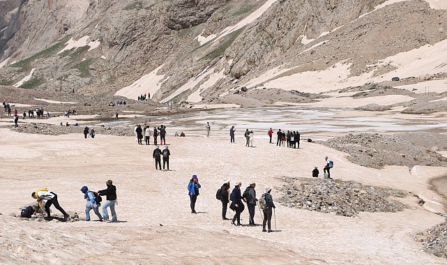 HAKKARİ'de uzun yıllar çıkılması ve gezilmesi kısıtlı olan, 4 bin 135 rakımlı Uludoruk'un yer aldığı Cilo-Sat Dağları'ndaki 20 bin yıllık buzullar ile Cennet Cehennem Vadisi'ne ilgi, her geçen gün artıyor. Bölgeye Türkiye'nin dört bir yanından doğasever akın ederken, Yüksekova TEMA Vakfı Temsilcisi Kenan Canan, küresel ısınmanın etkisiyle 20 bin yıllık buzulların alan kaybettiğini söyledi. Cumhurbaşkanlığı kararı ile 2020 yılında 'milli park' ilan edilen Cilo-Sat Dağları'ndaki buzul göllerini, her yıl Türkiye'nin çeşitli kentlerinden gelen yüzlerce doğasever ve dağcı ziyaret ediyor. Son yıllardaki huzur ortamı, PKK'nın silah bırakma süreci ve havaların ısınmaya başlaması da bölgedeki yoğunluğu artırdı. Türkiye'nin çeşitli yerlerinden gelen yaklaşık 400 doğasever ve dağcı grubu, kendilerine eşlik eden rehberler gözetiminde 4 bin 135 rakımlı Cilo-Sat Dağları'ndaki 20 bin yıllık buzullar ile Cennet Cehennem Vadisi'ni gezerek fotoğraf çekti. Buzulları görme imkanı bulan doğaseverler bölgeye hayran kaldıklarını belirtirken, Coğrafya Öğretmeni ve Yüksekova TEMA Vakfı Temsilcisi Kenan Canan buzulların erimesine dikkat çekti.'BİLİNÇLİ HAREKET EDİN' UYARISIKüresel ısınmanın etkisiyle 20 bin yıllık buzulların alan kaybettiğini belirten Kenan Canan, "Son yıllarda özellikle bütün dünyada olduğu gibi bizim bu bölgede de hem küresel ısınma hem de insanların etkisiyle ciddi bir erime söz konusu. Özellikle son yıllarda yoğun bir şekilde insanların bu bölgeye geldiğini görüyoruz. Gelen insanlarından tek istediğimiz, bölgeyi mutlaka rehberler eşliğinde gezsinler ve gezerken de kesinlikle buzullara basmamalarını istiyoruz. Çünkü her bastıkları alanda buzulun erimesine neden oluyorlar. Onlardan buzulları uzaktan izlemelerini, uzaktan fotoğraflamaları bekliyoruz. Bugün yoğun bir şekilde yine insanların buraya geldiğini görüyoruz. Bölgeyi, buzulları merak ediyorlar. Ama gelirken ve giderken de insanların bilinçli bir şekilde hareket etmelerini isteriz" dedi.