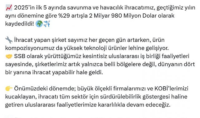SAVUNMA Sanayii Başkanı Haluk Görgün, 2025'in ilk 5 ayında savunma ve havacılık ihracatının, geçen yılın aynı dönemine göre yüzde 29 artışla 2 milyar 980 milyon dolara çıktığını duyurdu.Savunma Sanayii Başkanı Görgün, sosyal medya hesabından yaptığı açıklamada, "2025'in ilk 5 ayında savunma ve havacılık ihracatımız, geçtiğimiz yılın aynı dönemine göre yüze 29 artışla 2 milyar 980 milyon dolar olarak kaydedildi. İhracat yapan şirket sayımız her geçen gün artarken, ürün kompozisyonumuz da yüksek teknoloji ürünler lehine gelişiyor. SSB olarak yürüttüğümüz kesintisiz uluslararası iş birliği faaliyetleri sayesinde, şirketlerimiz artık yalnızca belli bölgelere değil, dünyanın dört bir yanına ihracat yapabilir hale geldi. Önümüzdeki dönemde; büyük ölçekli firmalarımızı ve KOBİ'lerimizi kucaklayan, ihracatı tüm sektör için sürdürülebilirlik göstergesi haline getiren uluslararası faaliyetlerimize kararlılıkla devam edeceğiz. Ülkemizin toplam ihracatının yüzde 3'ünden fazlasını gerçekleştiren tüm savunma sanayi ailemizi gönülden kutluyorum" dedi.