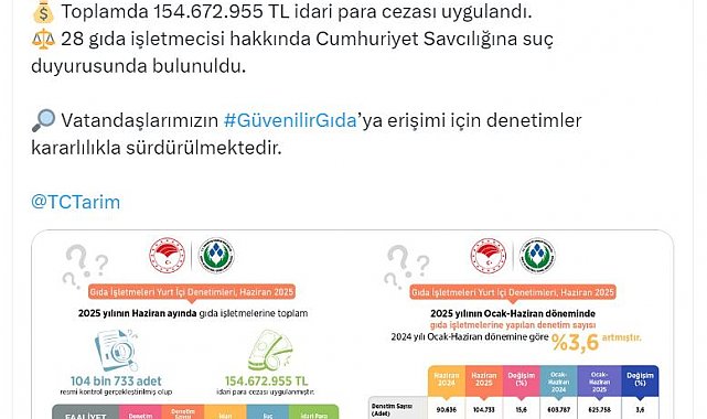 TARIM ve Orman Bakanlığı Gıda ve Kontrol Genel Müdürlüğü, haziran ayında 104 bin gıda işletmesinin denetlendiğini ve 154 milyon lira para cezası uygulandığını açıkladı.Gıda ve Kontrol Genel Müdürlüğü, sosyal medya hesabında, haziran ayında gıda işletmelerinde yapılan denetimlerin sonuçlarını paylaştı. Buna göre; haziranda 104 bin 733 gıda işletmesinde denetim yapıldı ve 1989 idari yaptırım uygulandı. Denetimlerde toplam 154 milyon 672 bin 955 TL idari para cezası uygulandı. Ayrıca, 28 gıda işletmecisi hakkında Cumhuriyet savcılığına suç duyurusunda bulunuldu. Öte yandan Müdürlüğün paylaştığı infografiğe göre; gıda işletmelerine yönelik denetimler, geçen yılın aynı ayına göre yüzde 15,6 arttı. 2025 Ocak-Haziran dönemindeki denetimlerde, geçen yıla göre yüzde 3,6 artış gerçekleşti. Söz konusu dönemde idari yaptırım oranı yüzde 27,7 artarken; suç duyurusu oranı yüzde 6,8 azaldı.