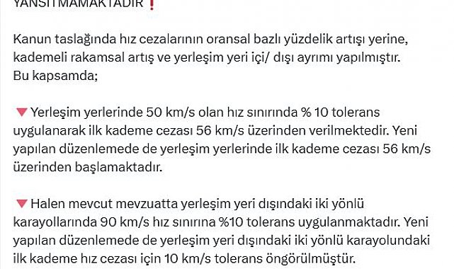 İÇİŞLERİ Bakanlığı'ndan yapılan açıklamada, Karayolları Trafik Kanunu'nda değişiklik yapılması öngörülen teklifle hız sınırı aşımında yüzde 10 ilk aşım tolerans uygulanmasının devam edeceği belirtildi.Bakanlıktan yapılan yazılı açıklamada, "Karayolları Trafik Kanun değişiklik taslağına istinaden bazı sosyal medya hesaplarında yer alan, 'Radar cezalarında sürücülere tanınan yüzde 10'luk tolerans payının kaldırıldığı, hız sınırını 1 kilometre/ saat dahi geçen sürücülere para cezası kesileceği' şeklindeki haber ve iddialar gerçeği yansıtmamaktadır. Kanun taslağında hız cezalarının oransal bazlı yüzdelik artışı yerine, kademeli rakamsal artış ve yerleşim yeri içi/ dışı ayrımı yapılmıştır. Bu kapsamda; yerleşim yerlerinde 50 kilometre/ saat olan hız sınırında yüzde 10 tolerans uygulanarak ilk kademe cezası 56 kilometre/ saat üzerinden verilmektedir. Yeni yapılan düzenlemede de yerleşim yerlerinde ilk kademe cezası 56 kilometre/ saat üzerinden başlamaktadır. Halen mevcut mevzuatta yerleşim yeri dışındaki iki yönlü karayollarında 90 kilometre/ saat hız sınırına yüzde 10 tolerans uygulanmaktadır. Yeni yapılan düzenlemede de yerleşim yeri dışındaki iki yönlü karayolundaki ilk kademe hız cezası için 10 kilometre/ saat tolerans öngörülmüştür. Sonuç olarak hız ile ilgili yerleşim yeri içerisinde 5 kilometre/ saat; yerleşim yeri dışındaki 10 kilometre/ saat ilk aşım tolerans uygulaması devam etmektedir" ifadelerine yer verildi.