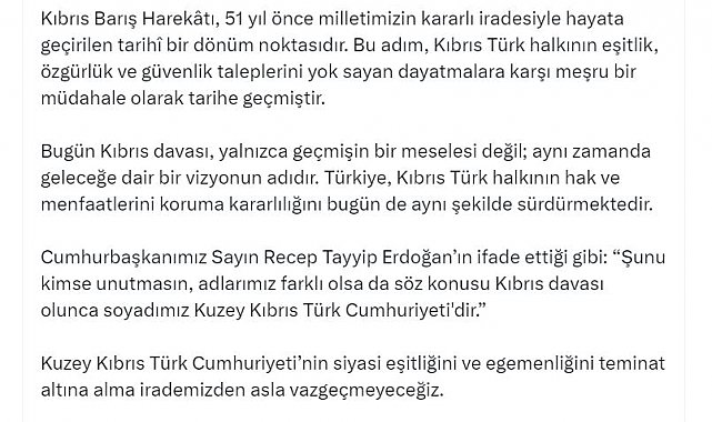 İletişim Başkanı Duran, Kıbrıs Barış Harekatı'nın 51'inci yıl dönümü ve '20 Temmuz Barış ve Özgürlük Bayramı' nedeniyle sosyal medya hesabından bir mesaj yayımladı. Duran, "Kıbrıs Barış Harekatı, 51 yıl önce milletimizin kararlı iradesiyle hayata geçirilen tarihi bir dönüm noktasıdır. Bu adım, Kıbrıs Türk halkının eşitlik, özgürlük ve güvenlik taleplerini yok sayan dayatmalara karşı meşru bir müdahale olarak tarihe geçmiştir. Bugün Kıbrıs davası, yalnızca geçmişin bir meselesi değil; aynı zamanda geleceğe dair bir vizyonun adıdır. Türkiye, Kıbrıs Türk halkının hak ve menfaatlerini koruma kararlılığını bugün de aynı şekilde sürdürmektedir. Cumhurbaşkanımız Sayın Recep Tayyip Erdoğan'ın ifade ettiği gibi: 'Şunu kimse unutmasın, adlarımız farklı olsa da söz konusu Kıbrıs davası olunca soyadımız Kuzey Kıbrıs Türk Cumhuriyeti'dir.' Kuzey Kıbrıs Türk Cumhuriyeti'nin siyasi eşitliğini ve egemenliğini teminat altına alma irademizden asla vazgeçmeyeceğiz. Bu anlamlı yıl dönümünde, Kıbrıs Türk halkının mücadelesine omuz veren aziz şehitlerimizi rahmetle, kahraman gazilerimizi minnetle anıyorum" ifadelerini kullandı.