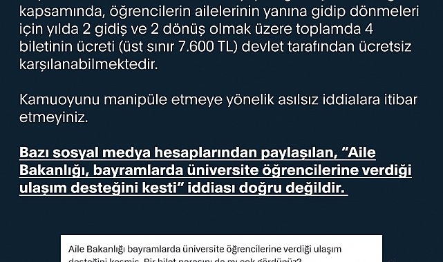 CUMHURBAŞKANLIĞI İletişim Başkanlığı Dezenformasyonla Mücadele Merkezi (DMM), "Bazı sosyal medya hesaplarından paylaşılan, 'Aile Bakanlığı, bayramlarda üniversite öğrencilerine verdiği ulaşım desteğini kesti' iddiası doğru değildir" açıklamasında bulundu.DMM'nin sosyal medya hesabından yapılan açıklamada, "Bazı sosyal medya hesaplarından paylaşılan, 'Aile Bakanlığı, bayramlarda üniversite öğrencilerine verdiği ulaşım desteğini kesti' iddiası doğru değildir. Aile ve Sosyal Hizmetler Bakanlığı'nın şehir dışında eğitim gören dar gelirli üniversite öğrencileri için sağladığı ulaşım desteğinin sonlandırılması söz konusu değildir. Başvuruların e-Devlet üzerinden yapıldığı ulaşım desteği kapsamında, öğrencilerin ailelerinin yanına gidip dönmeleri için yılda 2 gidiş ve 2 dönüş olmak üzere toplamda 4 biletinin ücreti (üst sınır 7.600 TL) devlet tarafından ücretsiz karşılanabilmektedir. Kamuoyunu manipüle etmeye yönelik asılsız iddialara itibar etmeyiniz" denildi.