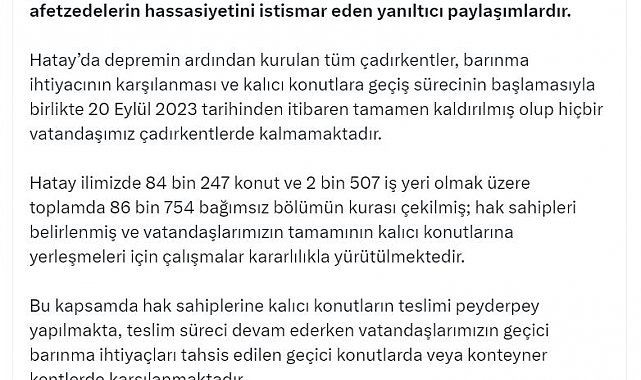 İLETİŞİM Başkanlığı Dezenformasyonla Mücadele Merkezi (DMM), 'Hatay'da hala çadırda kalan depremzedeler var' şeklindeki sosyal medya paylaşımlarına ilişkin, "Hatay'da depremin ardından kurulan tüm çadır kentler, barınma ihtiyacının karşılanması ve kalıcı konutlara geçiş sürecinin başlamasıyla birlikte 20 Eylül 2023 tarihinden itibaren tamamen kaldırılmış olup hiçbir vatandaşımız çadır kentlerde kalmamaktadır" açıklamasını yaptı.DMM'nin sosyal medya hesabından yapılan açıklamada, "Çeşitli sosyal medya hesaplarında 'Hatay'da hala çadırda kalan depremzedeler var' şeklinde paylaşılan içerikler, gerçeği yansıtmayan, kamuoyunda yanlış algı oluşturmayı amaçlayan ve afetzedelerin hassasiyetini istismar eden yanıltıcı paylaşımlardır. Hatay'da depremin ardından kurulan tüm çadır kentler, barınma ihtiyacının karşılanması ve kalıcı konutlara geçiş sürecinin başlamasıyla birlikte 20 Eylül 2023 tarihinden itibaren tamamen kaldırılmış olup hiçbir vatandaşımız çadır kentlerde kalmamaktadır. Hatay ilimizde 84 bin 247 konut ve 2 bin 507 iş yeri olmak üzere toplamda 86 bin 754 bağımsız bölümün kurası çekilmiş; hak sahipleri belirlenmiş ve vatandaşlarımızın tamamının kalıcı konutlarına yerleşmeleri için çalışmalar kararlılıkla yürütülmektedir" denildi.'SAHA GERÇEKLERİYLE BAĞDAŞMAYAN PAYLAŞIMLAR' Açıklamada ayrıca, "Hak sahiplerine kalıcı konutların teslimi peyderpey yapılmakta, teslim süreci devam ederken vatandaşlarımızın geçici barınma ihtiyaçları tahsis edilen geçici konutlarda veya konteyner kentlerde karşılanmaktadır. Sosyal medyada 'çadırlarda yaşam devam ediyor' iddiası, saha gerçekleriyle bağdaşmayan paylaşımlar olup, resmi kurumların açıklamaları dışındaki asılsız iddialara itibar edilmemesi önemle rica olunur" ifadelerine yer verildi.