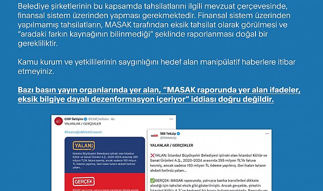 İLETİŞİM Başkanlığı Dezenformasyonla Mücadele Merkezi (DMM), "Bazı basın yayın organlarında yer alan, 'MASAK raporunda yer alan ifadeler, eksik bilgiye dayalı dezenformasyon içeriyor' iddiası doğru değildir" açıklamasında bulundu. DMM'nin sosyal medya hesabından yapılan açıklamada, "Bazı basın yayın organlarında yer alan, 'MASAK raporunda yer alan ifadeler, eksik bilgiye dayalı dezenformasyon içeriyor' iddiası doğru değildir. MASAK, raporlarını banka ve vergi kayıtları başta olmak üzere objektif ve nicel finansal veriler üzerinden hazırlamaktadır. Belirli tutarı (30 Kasım 2024 itibarıyla 30 bin TL) aşan tahsilatların, aracı finansal kurumlar kanalıyla yapılması yasal bir zorunluluktur. Belediye şirketlerinin bu kapsamda tahsilatlarını ilgili mevzuat çerçevesinde, finansal sistem üzerinden yapması gerekmektedir. Finansal sistem üzerinden yapılmamış tahsilatların, MASAK tarafından eksik tahsilat olarak görülmesi ve aradaki farkın kaynağının bilinmediği şeklinde raporlanması doğal bir gerekliliktir. Kamu kurum ve yetkililerinin saygınlığını hedef alan manipülatif haberlere itibar etmeyiniz" denildi.