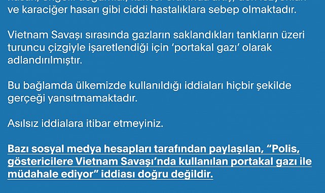 CUMHURBAŞKANLIĞI İletişim Başkanlığı Dezenformasyonla Mücadele Merkezi (DMM), "Bazı sosyal medya hesapları tarafından paylaşılan, 'Polis, göstericilere Vietnam Savaşı'nda kullanılan portakal gazı ile müdahale ediyor' iddiası doğru değildir" açıklamasında bulundu.DMM'nin sosyal medya hesabından yapılan açıklamada, "Bazı sosyal medya hesapları tarafından paylaşılan, 'Polis, göstericilere Vietnam Savaşı'nda kullanılan portakal gazı ile müdahale ediyor' iddiası doğru değildir. Kimyasal silah olan portakal gazı, Emniyet Genel Müdürlüğü tarafından hiçbir eylem ve gösteride kullanılmamaktadır. Portakal gazı kullanıldığı takdirde ciddi sağlık sorunları ortaya çıkmaktadır. Bu madde, gaza maruz kalan kişilerde DNA hasarı, engelli doğumlar, kanser oranında artış, deri lezyonları ve karaciğer hasarı gibi ciddi hastalıklara sebep olmaktadır. Vietnam Savaşı sırasında gazların saklandıkları tankların üzeri turuncu çizgiyle işaretlendiği için 'portakal gazı' olarak adlandırılmıştır. Bu bağlamda ülkemizde kullanıldığı iddiaları hiçbir şekilde gerçeği yansıtmamaktadır. Asılsız iddialara itibar etmeyiniz" ifadelerine yer verildi.