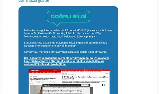 İLETİŞİM Başkanlığı Dezenformasyonla Mücadele Merkezi (DMM), gözaltına alınan İstanbul Büyükşehir Belediye Başkanı Ekrem İmamoğlu'nun sağlık kontrolünün karakolda yapıldığı ve ilaçlarının verilmediği iddialarını yalanladı.DMM'nin sosyal medya hesabından yapılan açıklamada, "Bazı basın yayın organlarında yer alan, 'Ekrem İmamoğlu'nun sağlık kontrolü hastaneye götürülmek yerine karakolda yapıldı, ilaçları verilmedi' iddiası doğru değildir. Bahse konu sağlık kontrolü İstanbul Emniyet Müdürlüğü yakınında bulunan İstanbul Tıp Fakültesi Ek Binasında, 2 Adli Tıp Uzmanı ve 1 Adli Tıp Teknisyenince doktor hasta özeline riayet edilerek yapılmıştır. Bununla birlikte gözaltında bulunanların kullanmakta olduğu rutin ilaçlar şahıslara emniyet birimlerince verilmektedir. Kamuoyunu manipüle etmeye yönelik asılsız iddialara itibar etmeyiniz" denildi.