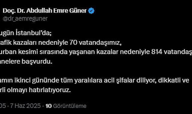 - İSTANBUL İl Sağlık Müdürü Emre Güner, sosyal medya hesabından yaptığı paylaşım ile Kurban Bayramı'nın ikinci gününde kurbanlıklarını kendileri kesmeye çalışırken yaralanan 814 kişi olduğunu açıkladı.İstanbul İl Sağlık Müdürü Emre Güner, Kurban Bayramı'nın ikinci gününde kurbanlıklarını kendileri kesmeye çalışan 814 kişinin çeşitli yerlerinden yaralanarak hastanelere başvurduğunu açıkladı. Sosyal medya hesabından açıklama yapan Güner, "Bugün İstanbul'da; trafik kazaları nedeniyle 70 vatandaşımız, kurban kesimi sırasında yaşanan kazalar nedeniyle 814 vatandaşımız hastanelere başvurdu. Bayramın ikinci gününde tüm yaralılara acil şifalar diliyor, dikkatli ve tedbirli olmayı hatırlatıyoruz" ifadelerini kullandı.