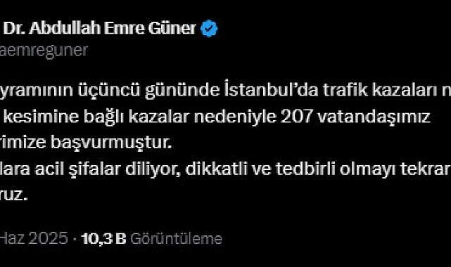 - İSTANBUL İl Sağlık Müdürü Emre Güner, sosyal medya hesabından yaptığı paylaşım ile Kurban Bayramı'nın üçüncü gününde kurbanlıklarını kendileri kesmeye çalışırken yaralanan 207 kişi olduğunu açıkladı.İstanbul İl Sağlık Müdürü Emre Güner, Kurban Bayramı'nın üçüncü gününde kurbanlıklarını kendileri kesmeye çalışan 207 kişinin çeşitli yerlerinden yaralanarak hastanelere başvurduğunu açıkladı. Sosyal medya hesabından açıklama yapan Güner, "Kurban Bayramının üçüncü gününde İstanbul'da trafik kazaları nedeniyle 37, kurban kesimine bağlı kazalar nedeniyle 207 vatandaşımız hastanelerimize başvurmuştur. Tüm yaralılara acil şifalar diliyor, dikkatli ve tedbirli olmayı tekrar hatırlatıyoruz" ifadelerini kullandı.