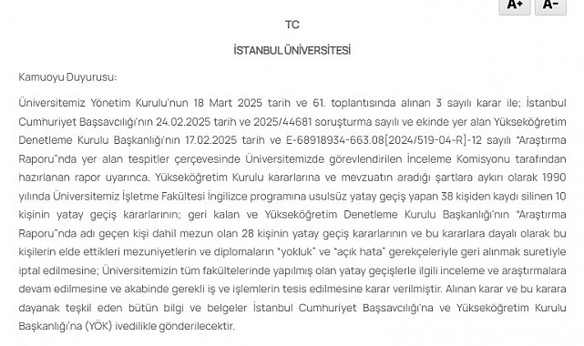 - İSTANBUL Üniversitesi, diploma soruşturmasına ilişkin açıklama yaptı. Açıklamada, "Araştırma Raporu'nda adı geçen kişi dahil mezun olan 28 kişinin yatay geçiş kararlarının ve bu kararlara dayalı olarak bu kişilerin elde ettikleri mezuniyetlerin ve diplomaların "yokluk" ve "açık hata" gerekçeleriyle geri alınmak suretiyle iptal edilmesine karar verilmiştir" ifadeleri yer aldı.Üniversiteden yapılan açıklamada, "Üniversitemiz Yönetim Kurulu'nun 18 Mart 2025 tarih ve 61. toplantısında alınan 3 sayılı karar ile; İstanbul Cumhuriyet Başsavcılığı'nın 24.02.2025 tarih ve 2025/44681 soruşturma sayılı ve ekinde yer alan Yükseköğretim Denetleme Kurulu Başkanlığı'nın 17.02.2025 tarih ve E-68918934-663.08[2024/519-04-R]-12 sayılı "Araştırma Raporu"nda yer alan tespitler çerçevesinde Üniversitemizde görevlendirilen İnceleme Komisyonu tarafından hazırlanan rapor uyarınca, Yükseköğretim Kurulu kararlarına ve mevzuatın aradığı şartlara aykırı olarak 1990 yılında Üniversitemiz İşletme Fakültesi İngilizce programına usulsüz yatay geçiş yapan 38 kişiden kaydı silinen 10 kişinin yatay geçiş kararlarının; geri kalan ve Yükseköğretim Denetleme Kurulu Başkanlığı'nın "Araştırma Raporu"nda adı geçen kişi dahil mezun olan 28 kişinin yatay geçiş kararlarının ve bu kararlara dayalı olarak bu kişilerin elde ettikleri mezuniyetlerin ve diplomaların "yokluk" ve "açık hata" gerekçeleriyle geri alınmak suretiyle iptal edilmesine; Üniversitemizin tüm fakültelerinde yapılmış olan yatay geçişlerle ilgili inceleme ve araştırmalara devam edilmesine ve akabinde gerekli iş ve işlemlerin tesis edilmesine karar verilmiştir. Alınan karar ve bu karara dayanak teşkil eden bütün bilgi ve belgeler İstanbul Cumhuriyet Başsavcılığı'na ve Yükseköğretim Kurulu Başkanlığı'na (YÖK) ivedilikle gönderilecektir" ifadeleri yer aldı.