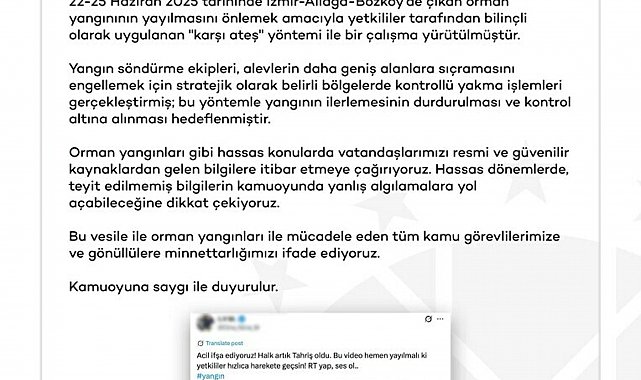 İZMİR'in Aliağa ilçesinde 25 Haziran'da çıkan orman yangınıyla ilgili bazı sosyal medya hesaplarında yayılan ve 'yangını başlatan kişi' olarak servis edilen görüntülerdeki kişinin, 'karşı ateş' taktiğiyle söndürme çalışması yapan bir itfaiye personeline ait olduğunu tespit eden Dezenformasyonla Mücadele Merkezi, sosyal medyadan konuya ilişkin açıklamada bulundu.Cumhurbaşkanlığı İletişim Başkanlığı'na bağlı Dezenformasyonla Mücadele Merkezi (DMM), sosyal medyada 'yangını başlatan kişi' olarak servis edilen bir görüntüyü tespit etti. Tespit edilen görüntüde ateş yakarak otları tutuşturan bir kişi görülürken, DMM bu görüntüdeki kişinin 'karşı ateş' taktiğiyle yangınla mücadele çalışmasında bulunan bir personel olduğunu açıkladı.'KARŞI ATEŞ YÖNTEMİ İLE BİR ÇALIŞMA YÜRÜTÜLMÜŞTÜR'Dezenformasyonla Mücadele Merkezi, X sosyal medya hesabından yaptığı yazılı açıklamada, "Sosyal medyada ve çeşitli platformlarda dolaşıma giren, İzmir-Aliağa-Bozköy'deki yangın kontrol çalışmalarına ait bir görüntünün, bir kişinin ormanı kasten yaktığı iddiasıyla servis edildiği tespit edilmiştir. 22-25 Haziran 2025 tarihinde İzmir-Aliağa-Bozköy'de çıkan orman yangınının yayılmasını önlemek amacıyla yetkililer tarafından bilinçli olarak uygulanan "karşı ateş" yöntemi ile bir çalışma yürütülmüştür. Yangın söndürme ekipleri, alevlerin daha geniş alanlara sıçramasını engellemek için stratejik olarak belirli bölgelerde kontrollü yakma işlemleri gerçekleştirmiş; bu yöntemle yangının ilerlemesinin durdurulması ve kontrol altına alınması hedeflenmiştir. Orman yangınları gibi hassas konularda vatandaşlarımızı resmi ve güvenilir kaynaklardan gelen bilgilere itibar etmeye çağırıyoruz. Hassas dönemlerde, teyit edilmemiş bilgilerin kamuoyunda yanlış algılamalara yol açabileceğine dikkat çekiyoruz. Bu vesile ile orman yangınları ile mücadele eden tüm kamu görevlilerimize ve gönüllülere minnettarlığımızı ifade ediyoruz. Kamuoyuna saygı ile duyurulur" ifadelerine yer verdi.