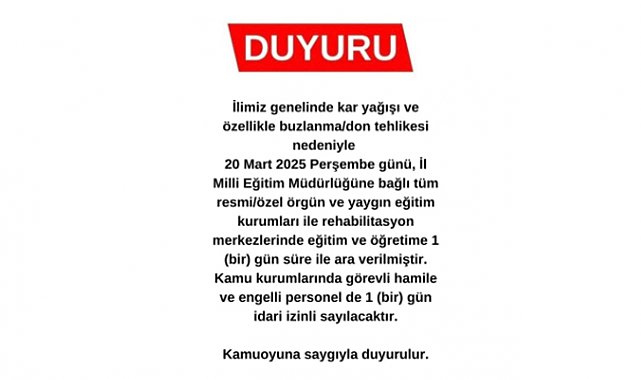 KARAMAN'da yoğun kar yağışı ve buzlanma tehlikesi nedeniyle il genelinde eğitime 1 gün ara verildi.Karaman'da etkili olan kar yağışının yarın da devam edeceğinin beklenmesi üzerine Karaman Valiliği il genelindeki resmi ve özel kreşler, anaokulları, ilkokullar, ortaokullar, liseler, mesleki eğitim merkezleri, yaygın eğitim kurumları, özel öğretim kursları, özel eğitim ve rehabilitasyon merkezlerinde 20 Mart Perşembe günü eğitime ara verildiğini duyurdu. Kamu kurumlarında görevli hamile ve engelli personellerin de 1 gün idari izinli sayılacağı belirtildi. Öte yandın İç Anadolu'yu Akdeniz'e bağlayan Sertavul Geçidi de yoğun kar yağışı ve tipi nedeniyle ulaşıma kapatıldı.