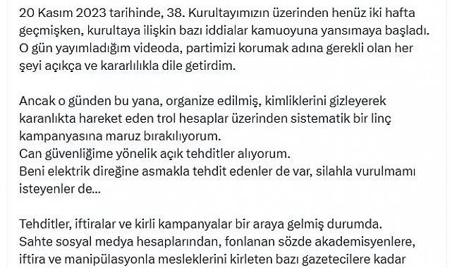 ESKİ CHP Genel Başkanı Kemal Kılıçdaroğlu, CHP 38'inci Olağan Kurultayı'na ilişkin, "Eğer ortada bir gerçeklik varsa, onu eğip bükmeden, çekinmeden, dimdik bir duruşla dile getirmekten asla geri durmam" dedi.Eski CHP Genel Başkanı Kemal Kılıdaroğlu, sosyal medya hesabından yaptığı açıklamada, "Sessizliğimiz suskunluk değil, sorumluluktur. 20 Kasım 2023 tarihinde, 38'inci Kurultayımızın üzerinden henüz iki hafta geçmişken, kurultaya ilişkin bazı iddialar kamuoyuna yansımaya başladı. O gün yayımladığım videoda, partimizi korumak adına gerekli olan her şeyi açıkça ve kararlılıkla dile getirdim. Ancak o günden bu yana, organize edilmiş, kimliklerini gizleyerek karanlıkta hareket eden trol hesaplar üzerinden sistematik bir linç kampanyasına maruz bırakılıyorum. Can güvenliğime yönelik açık tehditler alıyorum. Beni elektrik direğine asmakla tehdit edenler de var, silahla vurulmamı isteyenler de. Tehditler, iftiralar ve kirli kampanyalar bir araya gelmiş durumda. Sahte sosyal medya hesaplarından fonlanan sözde akademisyenlere, iftira ve manipülasyonla mesleklerini kirleten bazı gazetecilere kadar uzanan geniş bir cepheyle karşı karşıyayız. Ve ne yazık ki dün siyasi ikballeri uğruna yanımda saf tutan, bir zamanlar benimle yol yürümeyi bir övünç sayarken bugün başka mecralara savrulmuş bazı siyasetçiler de bu koroya katılmış durumda. Hepsi bir ağızdan, hiçbir bilgi sahibi olmadığım, hiçbir dahlimin bulunmadığı bir konuda konuşmamı talep ediyorlar" dedi. 'HALKLA KONUŞAN BİR SİYASETÇİYİM'Milletin gündeminden sapmadan yürümek zorunda olduğunu ifade eden Kılıçdaroğlu, "Şahsi değil kamusal olana, dedikoduya değil hakikate yaslanmak zorundayız. Ben, polemikle değil halkla konuşan bir siyasetçiyim. Ve beni tanıyan herkes bilir; eğer ortada bir gerçeklik varsa, onu eğip bükmeden, çekinmeden, dimdik bir duruşla dile getirmekten asla geri durmam. Beni direklere asacaklara, silahla vuracaklara, beni yakacaklara, taşlatacaklara, bir adım attırmayacaklara ve lamalara söylüyorum, sizden korkan sizden namerttir. Benden bir mesaj bekleyen herkese buradan açıkça sesleniyorum; herkes bilsin ki bu partinin düşmanlarını, yine bu partinin harem-i ismetinde boğmaya muktediriz" açıklamasında bulundu.