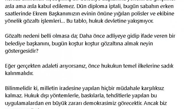 ANKARA Büyükşehir Belediye Başkanı Mansur Yavaş, "Bu ülkede hukukun üstünlüğünü, demokrasiyi ve millet iradesini savunan herkes bilmelidir ki seçilmiş bir belediye başkanına yönelik bu girişimler asla ama asla kabul edilemez" dedi.Ankara Büyükşehir Belediye Başkanı Mansur Yavaş, İstanbul Büyükşehir Belediye Başkanı Ekrem İmamoğlu'nun gözaltına alınmasına ilişkin sosyal medya hesabından yaptığı açıklamada, "Bu ülkede hukukun üstünlüğünü, demokrasiyi ve millet iradesini savunan herkes bilmelidir ki seçilmiş bir belediye başkanına yönelik bu girişimler asla ama asla kabul edilemez. Dün diploma iptali, bugün sabahın erken saatlerinde Ekrem Başkanımızın evinin önüne yığılan polisler ve ekibine yönelik gözaltı işlemleri. Bu tablo, hukuk devletine yakışmıyor. Gözaltı nedeni belli olmasa da daha önce adliyeye gidip ifade veren bir belediye başkanını, bugün koştur koştur gözaltına almak neyin göstergesidir. Eğer gerçekten adaleti arıyorsanız, önce hukukun temel ilkelerine sadık kalınmalıdır. Bilinmelidir ki milletin iradesine yapılan hiçbir müdahale karşılıksız kalmaz. Hukuk dışı yöntemlerle, baskılarla, tehditlerle yapılan bu uygulamalardan en büyük zararı demokrasimiz görecektir. Ancak biz susmayacağız. Hiç kimse de unutmasın; Ekrem Başkanımız yalnız değildir" ifadelerini kullandı.