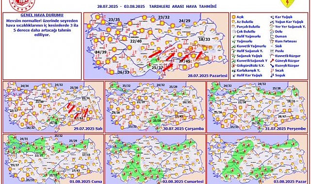 METEOROLOJİ Genel Müdürlüğü, yurt genelinde mevsim normalleri üzerinde seyreden hava sıcaklıklarının iç kesimlerde 3 ila 5 derece artacağını açıkladı.Meteoroloji Genel Müdürlüğü, 28 Temmuz-3 Ağustos tarihlerine ilişkin haftalık hava tahminlerini açıkladı. Buna göre; mevsim normalleri üzerinde seyreden hava sıcaklıkları iç kesimlerde 3 ila 5 derece artacak. Bugün, Marmara, Ege, Batı Karadeniz'in tamamında az bulutlu ve açık havanın etkili olması bekleniyor. Akdeniz Bölgesi'nde, az bulutlu ve açık, doğusunun parçalı ve yer yer çok bulutlu, Doğu Akdeniz'in Toroslar kesiminin yerel olmak üzere sağanak ve gök gürültülü sağanak yağışlı geçeceği tahmin ediliyor. Rüzgarın bölgenin doğusunda güney ve güneybatı yönlerden kuvvetli ve kısa süreli fırtına (50-70 km/saat) şeklinde eseceği tahmin ediliyor. İç Anadolu Bölgesi'nde, az bulutlu ve açık, doğusunda yer yer parçalı bulut bekleniyor. Rüzgarın, bölgenin güneydoğusunda güney ve güneybatı yönlerden kuvvetli ve kısa süreli fırtına (50-70 km/saat) şeklinde esmesi bekleniyor. DOĞU'DA TOZ TAŞINIMI BEKLENTİSİOrta ve Doğu Karadeniz'de, havanın az bulutlu ve açık, doğusunun parçalı bulutlu olması tahmin ediliyor. Doğu Anadolu'da parçalı ve az bulutlu geçecek. Rüzgarın, bölgenin güneybatısında güney ve güneybatı yönlerden kuvvetli ve kısa süreli fırtına (50-70 km/saat) şeklinde esmesi bekleniyor. Bölge genelinde toz taşınımı görüleceği tahmin ediliyor. Güneydoğu Anadolu Bölgesi'nde de hava az bulutlu ve açık bulutlu geçecek. Rüzgarın, bölge genelinde güney ve güneybatı yönlerden kuvvetli ve kısa süreli fırtına (50-70 km/saat) şeklinde esmesi bekleniyor. Bölge genelinde toz taşınımı görüleceği tahmin ediliyor.