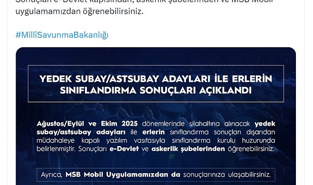 MİLLİ Savunma Bakanlığı (MSB), Ağustos, Eylül ve Ekim 2025 dönemlerinde silahaltına alınacak yedek subay/astsubay adayları ile erlerin sınıflandırma sonuçlarının açıklandığını duyurdu.Bakanlığın sosyal medya hesabından yapılan açıklamada, "Ağustos, Eylül ve Ekim 2025 dönemlerinde silahaltına alınacak yedek subay/astsubay adayları ile erlerin sınıflandırma sonuçları açıklandı. Sonuçları e-Devlet kapısından, askerlik şubelerinden ve MSB Mobil uygulamamızdan öğrenebilirsiniz" denildi.