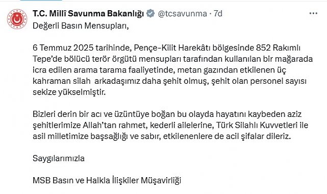 MİLLİ Savunma Bakanlığı (MSB), Pençe-Kilit Harekat bölgesindeki bir mağarada yapılan arama- tarama faaliyeti sırasında metan gazına maruz kalan 19 askerden 3'ünün daha şehit olduğunu açıkladı.Bakanlığın sosyal medya hesabından yapılan açıklamada, "06 Temmuz 2025 tarihinde, Pençe-Kilit Harekâtı bölgesinde 852 Rakımlı Tepe'de bölücü terör örgütü mensupları tarafından kullanılan bir mağarada icra edilen arama tarama faaliyetinde, metan gazından etkilenen üç personelimiz daha şehit olmuş, şehit olan personel sayısı sekize yükselmiştir. Bizleri derin bir acı ve üzüntüye boğan bu olayda hayatını kaybeden aziz şehitlerimize Allah'tan rahmet, kederli ailelerine, Türk Silahlı Kuvvetleri ile asil milletimize başsağlığı ve sabır, etkilenenlere de acil şifalar dileriz" denildi.
