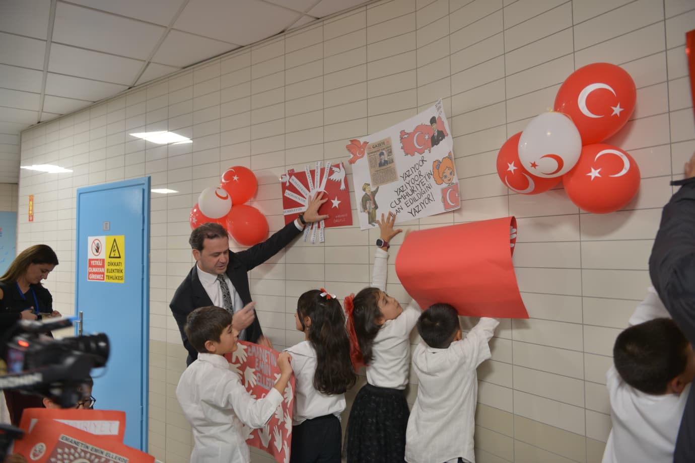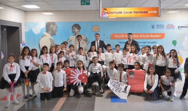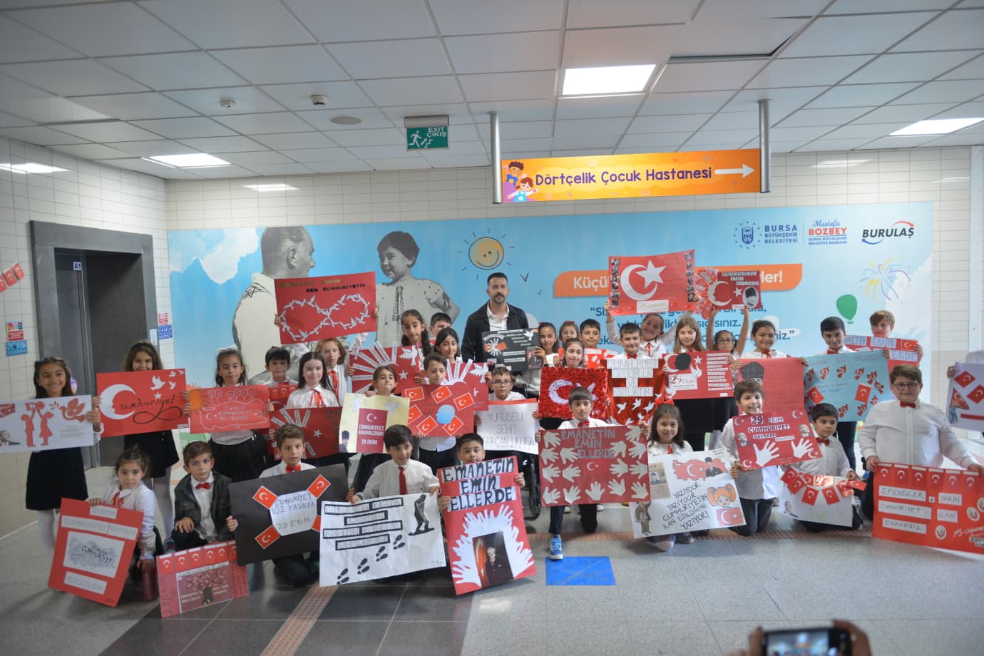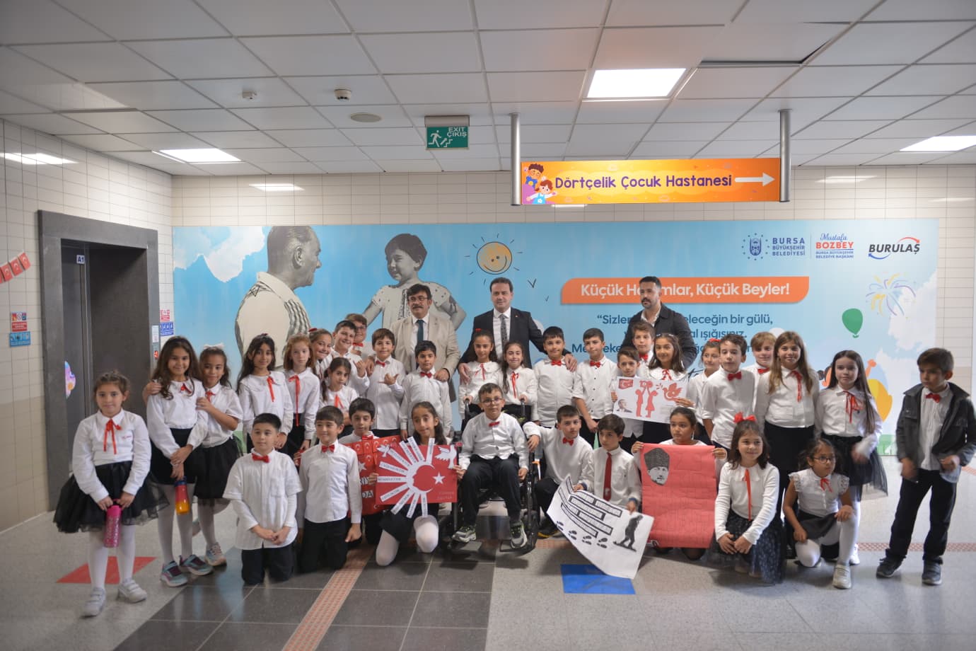 Bursa Büyükşehir Belediyesi Genel Sekreter Yardımcısı Ali Altunsoy ve BURULAŞ Genel Müdürü Fahrettin Beşli de etkinliğe katılarak çocukların mutluluğuna ortak oldu. Çocukların hazırladığı çalışmalarla 29 Ekim heyecanının Dörtçelik Çocuk Hastanesi Metro İstasyonu’nda da yaşandığını söyleyen Altunsoy, emeği geçen öğrencileri tebrik ederek Cumhuriyet Bayramlarını kutladı.