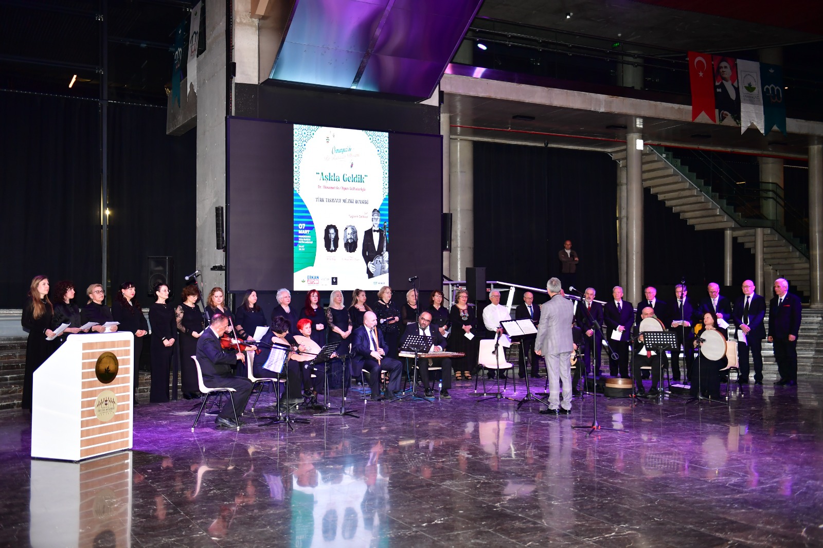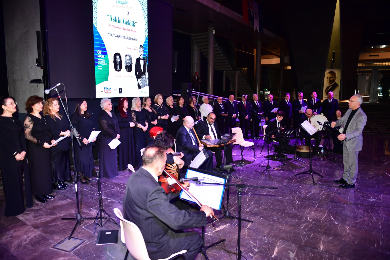 Osmangazi Belediyesi’nin “Osmangazi’de Bir Ramazan Akşamı” programı kapsamında düzenlediği ‘Aşkla Geldik’ tasavvuf müziği konseri, sanatseverlere manevi atmosferi yüksek bir gece yaşattı.Ramazan ayının manevi iklimini kültür ve sanat etkinlikleriyle zenginleştiren Osmangazi Belediyesi, “Osmangazi’de Bir Ramazan Akşamı” programı kapsamında ‘Aşkla Geldik’ tasavvuf müziği konserine ev sahipliği yaptı. Panorama 1326 Bursa Fetih Müzesi’nde tasavvuf müziğinin derin anlam dünyasını yansıtan eserlerin seslendirildiği konser, katılımcılara unutulmaz bir Ramazan akşamı yaşattı. Dr. Hüsamettin Olgun’un güfteleriyle, Tuğberk Çelikkol’un şefliğinde gerçekleşen konser, tasavvuf müziğinin ruhani atmosferini izleyicilere en güçlü şekilde hissettirdi. Manevi duyguların yoğun olarak yaşandığı geceye Ertan Bilgi de konuk sanatçı olarak katkı sunarken, değerli eserler dinleyicilerin alkışları eşliğinde seslendirildi. Program boyunca salonda bulunan sanatseverler, tasavvuf müziğinin derinlikli ezgileriyle adeta manevi bir yolculuğa çıktı.