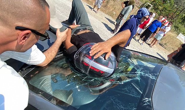 YALOVA'nın Çınarcık ilçesinde otomobilin arkadan çarptığı motosikletin sürücüsü, aracın ön camına düşerek yaralandı. Yaralı sürücü otomobilin üzerinde ambulans beklerken, o anlar cep telefonuyla görüntülendi.Kaza, saat 13.30 sıralarında Yalova-Armutlu kara yolu Çınarcık ilçesi Esenköy beldesi girişinde meydana geldi. Yalova yönüne giden 34 DJP 678 plakalı otomobil, aynı yöne seyreden 77 ADN 504 plakalı motosiklete arkadan çarptı. Çarpmanın etkisiyle motosiklet yola savrulurken, sürücü ise otomobilin ön camının üstüne düşerek yaralandı. İhbar üzerine kaza yerine jandarma ve sağlık ekipleri sevk edildi. Düştüğü yerde ambulans bekleyen sürücü, sağlık ekibinin ilk müdahalesinin ardından Yalova Eğitim ve Araştırma Hastanesi'ne kaldırılarak tedaviye alındı.Yaralının sağlık durumunun iyi olduğu öğrenilirken, kazayla ilgili soruşturma başlatıldı.