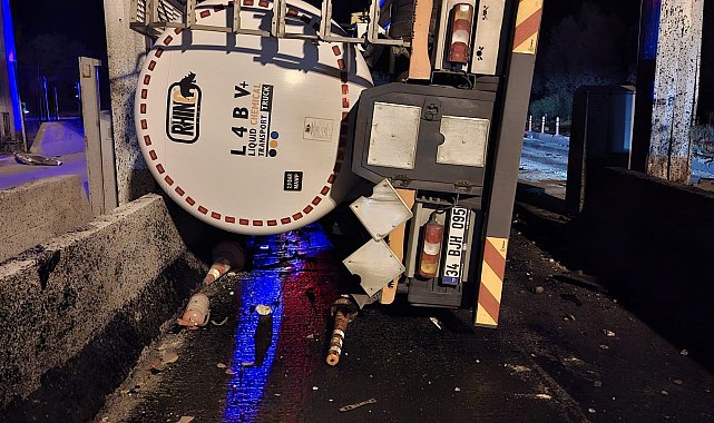 BOLU'nun Gerede ilçesi Anadolu Otoyolu'ndaki gişelere çarpıp devrilen tankerin sürücüsü Reşit A. yaralandı.Kaza, saat 01.30 sıralarında Anadolu Otoyolu'nun Gerede gişelerinde meydana geldi. Karadeniz bağlantı yolu istikametine seyir halinde olan Reşit A. idaresindeki 34 BJH 095 plakalı boş tanker, sürücüsünün direksiyon hakimiyetini kaybetmesi sonucu gişelere çarparak devrildi. Yoldan geçen diğer sürücüler 112 Acil Çağrı Merkezi'ne haber verdi. İhbarla bölgeye jandarma, sağlık ve itfaiye ekipleri sevk edildi. Araçta sıkışan sürücü Reşit A., itfaiye ekipleri tarafından çıkarıldı. Ambulansla Gerede Devlet Hastanesi'ne kaldırılan yaralının durumunun iyi olduğu belirtilirken, kazayla ilgili soruşturma başlatıldı.